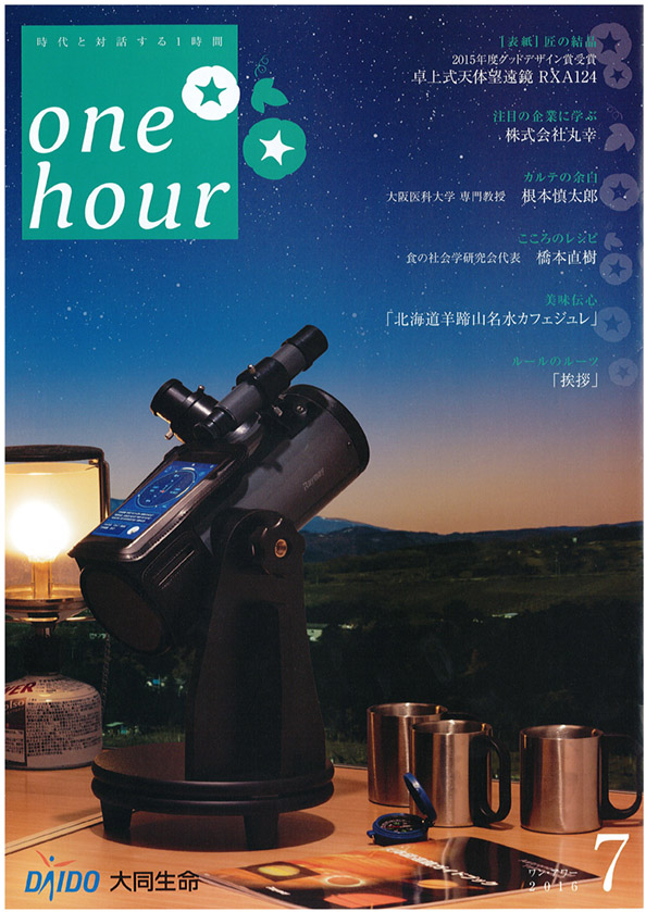 「one hour」は、主に大同生命のお客様へ配布されている広報誌で、注目の企業や医療、食生活にまつわるお話など、私たちの生活と密接に関わっている分野の記事が掲載されています。