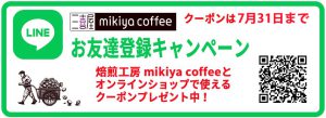 LINEお友達登録をしていただくと、焙煎工房 mikiya coffeeとオンラインショップで使えるクーポンをプレゼント中です。